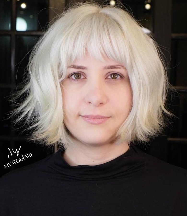Un bob texturizzato con frangetta, che offre un’atmosfera moderna e un po’ spigolosa, particolarmente adatta a chi ha una forma del viso ovale o oblunga. Utilizzate una crema styling leggera o uno spray texturizzante per esaltare gli strati e mantenere il look spettinato.