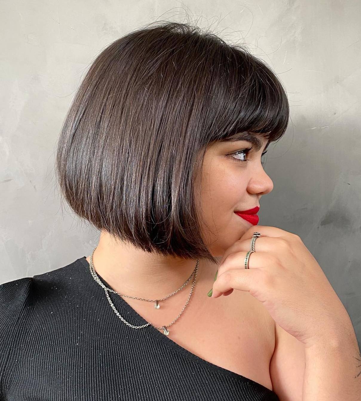 Bob elegante e smussato con frangia piena e dritta, che crea un look chic e sofisticato, ideale per i visi rotondi o ovali. Mantenete la morbidezza e la lucentezza con un siero di alta qualità e una piastra per capelli per una finitura lucida.